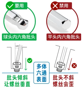 槽内空间小,球头内六角可与螺丝呈微斜角度安装,更能确保螺丝垂直拧入六通。