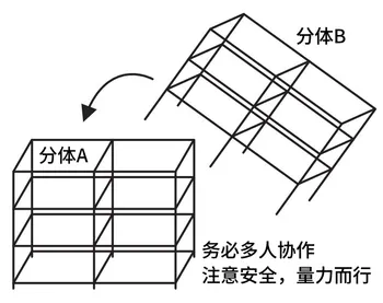 如果需要搭较高的框架,且有人协作,可以考虑分体安装框架,再将分体搬上去装,这样人就不需要站在梯子上干活了,多体框架厚重,请务必量力而行,避免扭伤或被掉落框架砸伤。